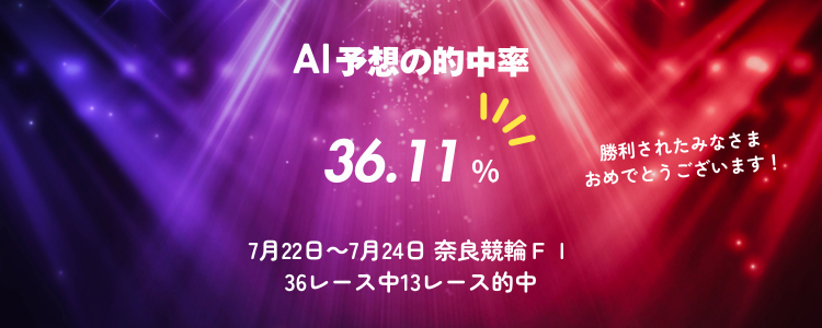 ※AI予想の的中率は、対象開催の全レースにおいて、AI予想の印4種類(◎、○、△、×)の組み合わせ全て(3連単4車BOX=24組)を購入した場合を条件として判定します。