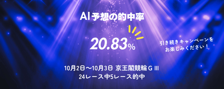 | チャリカ1万円分:AI予想に勝利された方全員 チャリカ3万円分:AI予想に勝利された方の中で的中率が最も高かった方1名 ※的中率トップの方には合計4万円分のチャリカをプレゼントいたします。 ※的中率トップの方が同率で複数の場合は、それぞれの方に合計4万円分のチャリカをプレゼントいたします。 |